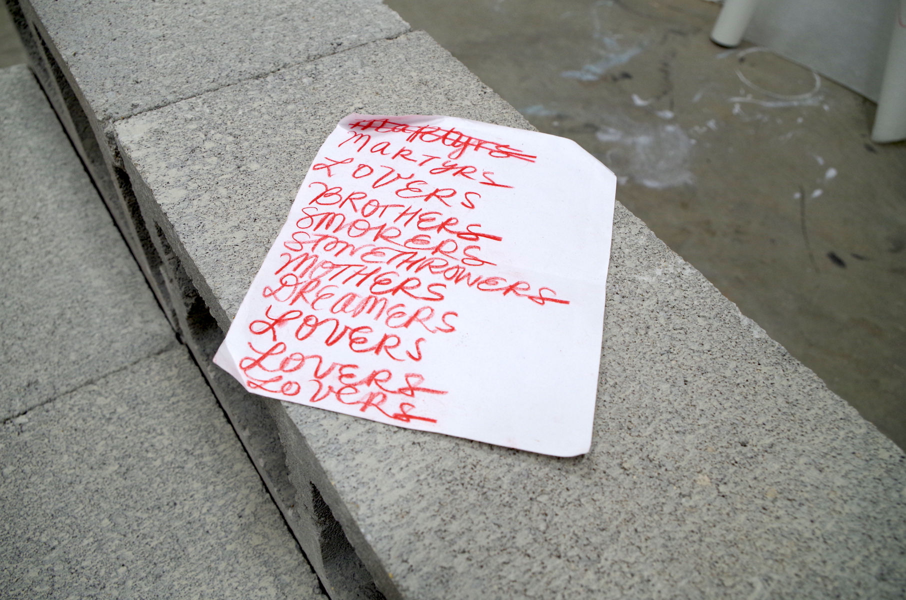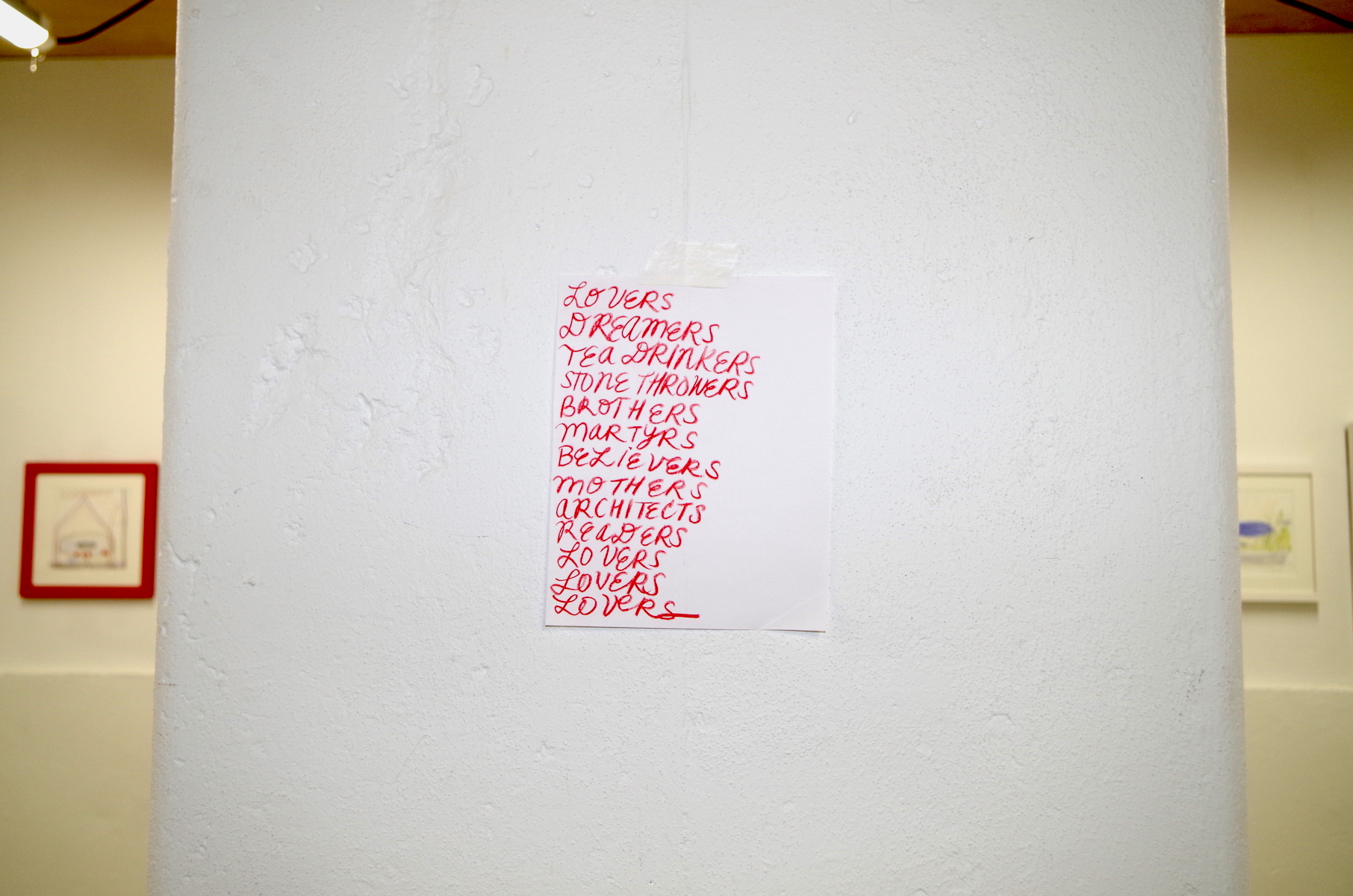 The main gallery space of lovers, lovers, lovers of the land is framed by minimal drawings, text-based works on paper, and sculptural gestures. Suggesting the power of absence as presence, the gaps left in the work serve as a catalyst for communal activations in the adjoining sitting room. In contemplating the absence of the original work among the presence of drawings, poetry, and a built environment, this exhibition examines issues of colonization and displacement as well as care and community.