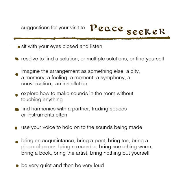 peace seeker was an installation of new and old objects and instruments made from second-hand materials and a quiet space for meditation. Viewers were encouraged to touch the sculptures gently while listening for harmony in the sounds made by the interactions, understanding they are in a fragile and changing state. As vessels are turned into idiophones, sound becomes a way of searching for new ways of listening, hearing, and understanding what is possible in this new world. A visit to the installation is a practice in feeling the resonance and interconnectedness of all things in this world.